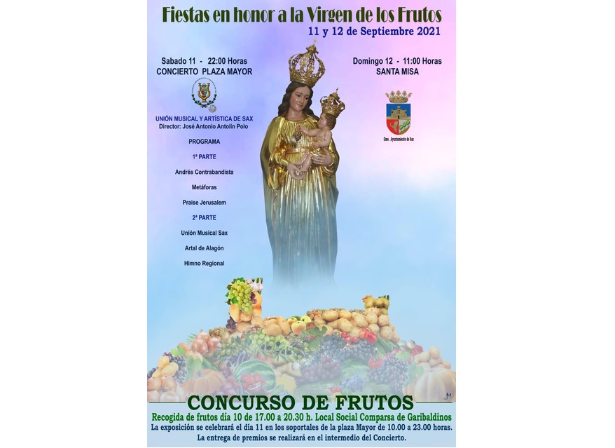 La Unión Musical y Artística de Sax ofrecerá su tradicional concierto en honor a la Virgen de los Frutos el próximo sábado 11 de septiembre a las 20:00 horas en la Plaza Mayor de Sax, organizado por el Ilmo. Ayuntamiento de Sax.