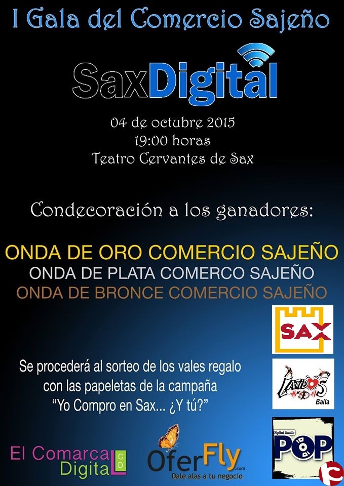 Domingo 4 de octubre y en el Teatro Municipal Cervantes, con entrada gratuita, a las 19:00 horas se prevé que dará comienzo la I Gala del Comercio Sajeño, donde ya están confirmadas las actuaciones de Javi Lovesong, Los Rockolas y los bailes Latidos Baila. En premios se extraerán premios para consumir en Comercios Sajeños.