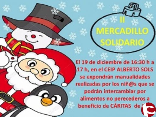El viernes 19 se celebra el II MERCADILLO SOLIDARIO en el cual se intercambiarán alimentos a beneficio de CARITAS DE SAX por manualidades navideñas realizadas por los alumnos del centro. El horario de dicha actividad será de 16:30 a 17:00 horas en el patio del colegio.