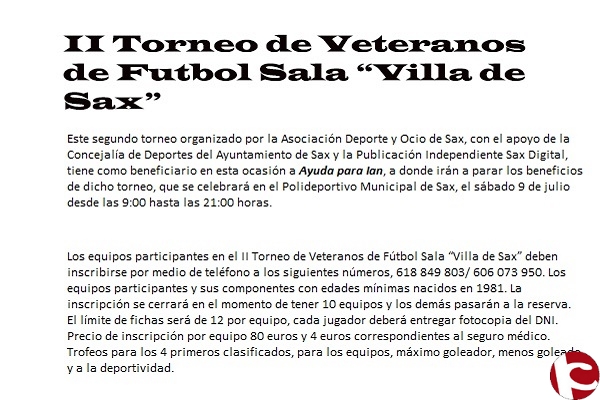 Este segundo torneo organizado por la Asociación deporte y ocio de Sax, con el apoyo de la Concejalía de Deportes del AYuntamiento de Sax y la publicación independiente Sax Digital, es a beneficio de IAN. Se celebrará en el polideportivo municipal el sábado 9 de julio desde las 9:00 horas hasta las 21.00 horas.