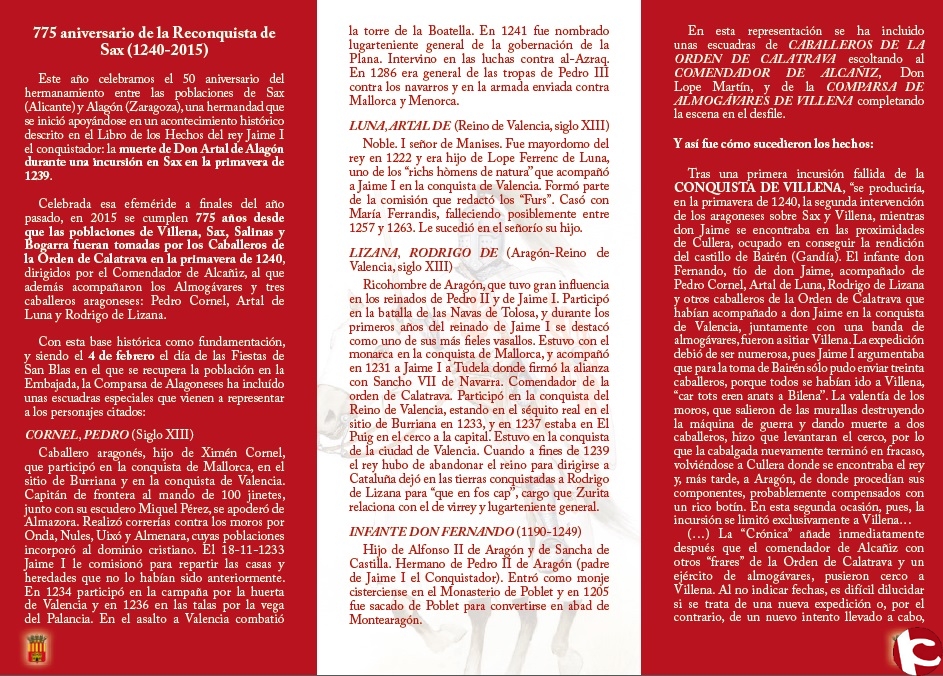 Información 775 aniversario reconquista de Sax,Comparsa de Alagoneses.