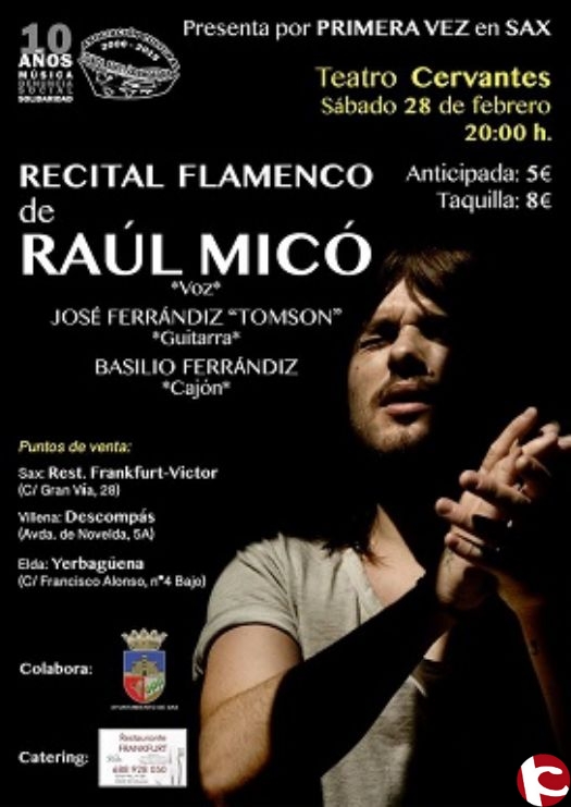 El colectivo Somos Anti Xenofobia celebra su décimo aniversario, este año 2015. Denuncia Social y Solidaridad, una programación muy interesante que ya tiene sus primeras fechas y actividades confirmadas. El sábado 28 de Febrero a partir de las 20:00 horas el Teatro Municipal Cervantes de Sax, sonara a flamenco, con la actuación del villenense Raúl Micó, considerado uno de los artistas más relevantes de este estilo a nivel provincial, estará acompañado por José Ferrándiz «Tomson» (Guitarra), Basilio Ferrándiz (Cajón). Entrada Anticipada 5,00 (Restaurante Frankfurt-Víctor) y el mismo día del concierto Entrada Taquilla 8,00 (a partir de las 19.30 h.)
