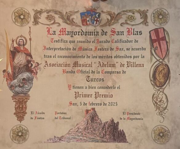 En un reñido concurso, la Asociación Musical Adelum de Villena se ha alzado con la victoria en el prestigioso Concurso de Bandas de Música de las fiestas de Sax 2025 celebrado el pasado 1 de febrero. Tras trece años de participación junto a la comparsa de Turcos, la formación villenense ha conseguido, por primera vez, el ansiado primer puesto en este certamen de gran nivel musical.