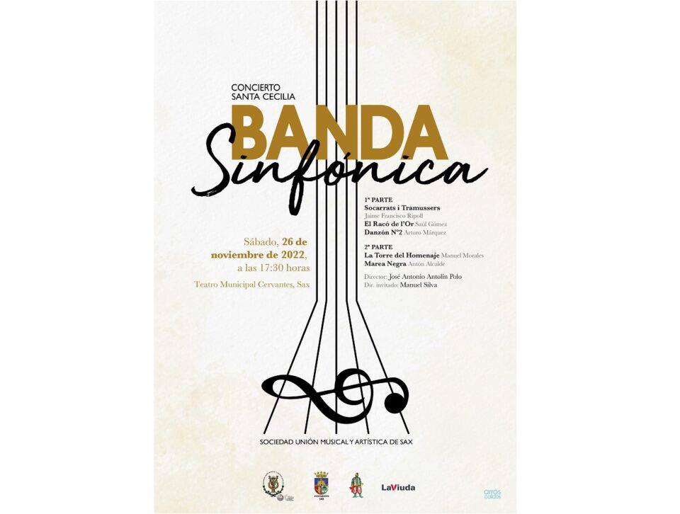 La banda sinfónica de la Unión Musical y Artística de Sax ofrecerá el próximo sábado 26 de noviembre a las 17:30h en el Teatro Municipal Cervantes de Sax su tradicional concierto en honor a Santa Cecilia, patrona de la música.