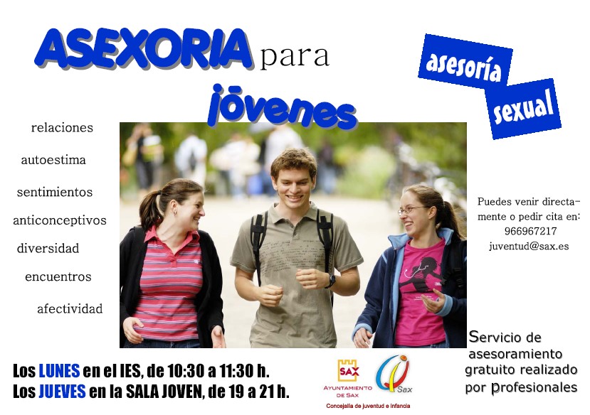 El objetivo de este servicio, que ya se estaba realizando en el I.E.S. de Sax en horario matutino, es el de ofrecer un espacio de referencia en materia de sexualidad que sea público, gratuito y confidencial.