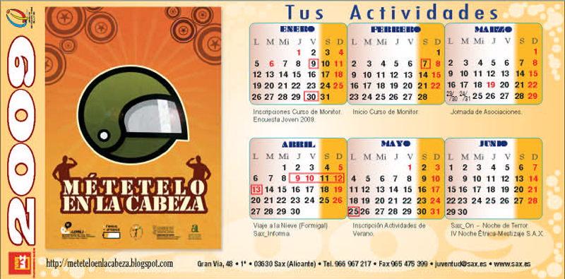 En los próximos días, 2.193 jóvenes sajeños recibirán la Encuesta Joven (1.603 jóvenes la recibirán en su domicilio y 590 en el IES Pascual Carrión), junto con un calendario de sobremesa en el que se indican las actividades que, organizadas directamente por la Concejalía de Juventud e Infancia o con su colaboración, están previstas para 2009. Como novedad, en esta ocasión, este departamento ha apostado por incluir en el calendario la imagen de dos campañas en las que colabora anualmente: “Métetelo en la cabeza”, organizada por la COMIJ en colaboración con otras entidades (http://meteteloenlacabeza.blogspot.com), y “Condonéate”, organizada por el Consejo de la Juventud de España y el Ministerio de Sanidad y Consumo (www.condoneate.org).