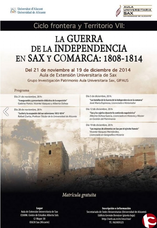 Dentro del ciclo de frontera y territorio VII «La guerra de la independencia en Sax y comarca 1808 -1814» organizado por la Universidad de Alacant, se impartirá en Sax en el Aula Universitaria sita en la Casa Alberto Sols del 21 de noviembre al 19 de diciembre, por el grupo de investigación del patrimonio GIPAUS. El horario sera a las 20:00 horas y los dias 21 y 28 de noviembre, 5, 12 y 19 de diciembre de 2014.