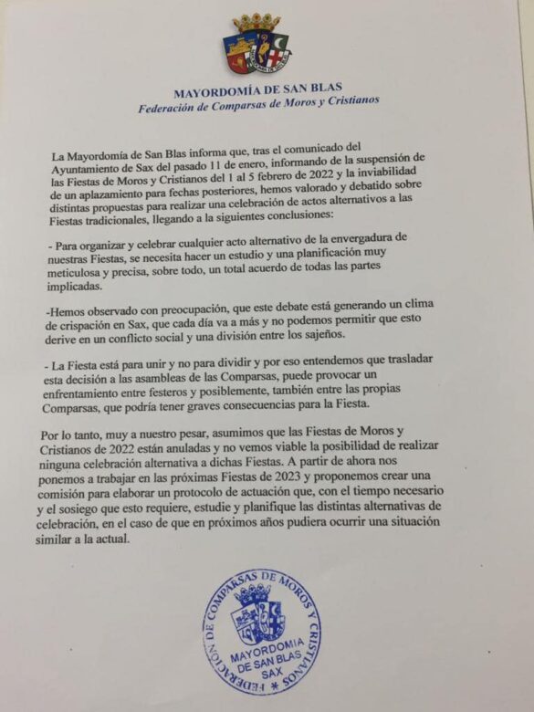 Desde la Mayordomía de San Blas se quiere aclarar que las Fiestas de Moros y Cristianos de Sax 2022 están anuladas, ya que no ven viable la posibilidad de realizar ninguna celebración alternativa a dichas Fiestas en otra fecha, por tanto, la Mayordomía se pone ya a trabajar para preparar las Fiestas del año 2023.