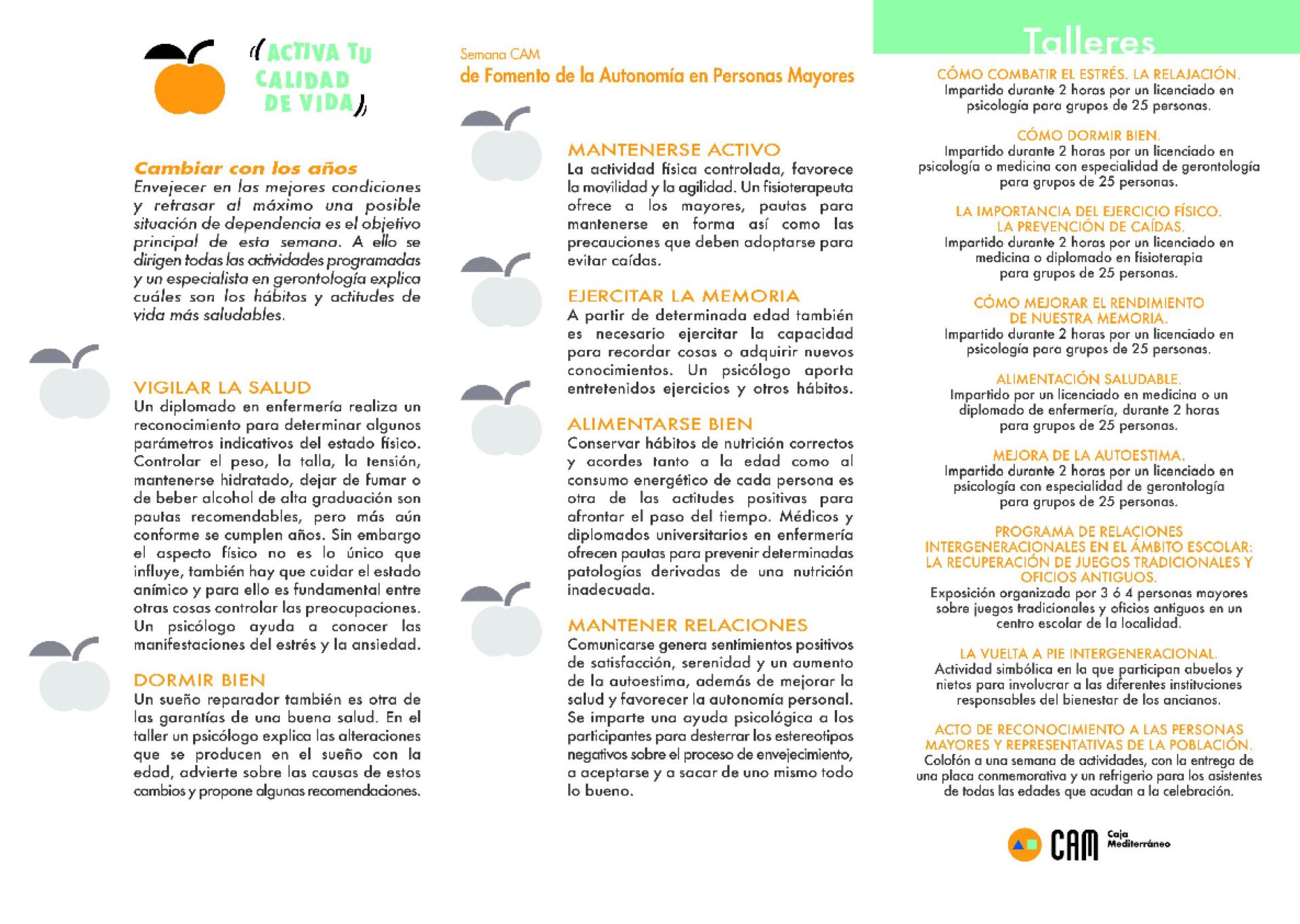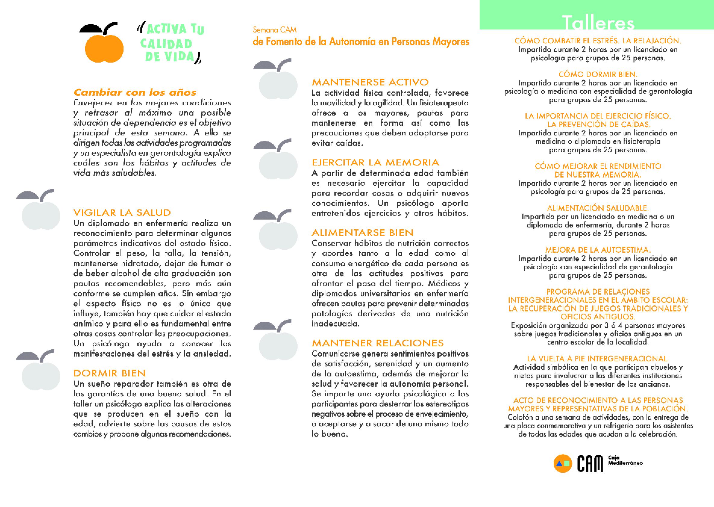 Sax acoge hasta el próximo sábado las últimas actividades programadas con motivo de la Semana de Autonomía Personal que, organizada por la Concejalía de Bienestar Social en colaboración con CAM, dio comienzo el pasado lunes 18 de mayo. Bajo el eslogan Activa tu calidad de vida, este proyecto está pensado expresamente para las personas de más de 60 años de edad. Se trata de una oferta de iniciativas, concentrada en seis días, que permite a quienes sobrepasan esa edad hacer una revisión de su estado de salud, tanto de los aspectos físicos como de los psicológicos, y conocer, gracias al asesoramiento de diferentes profesionales, las pautas de vida y de entrenamiento que, día a día, ayudan a conservan la autonomía.