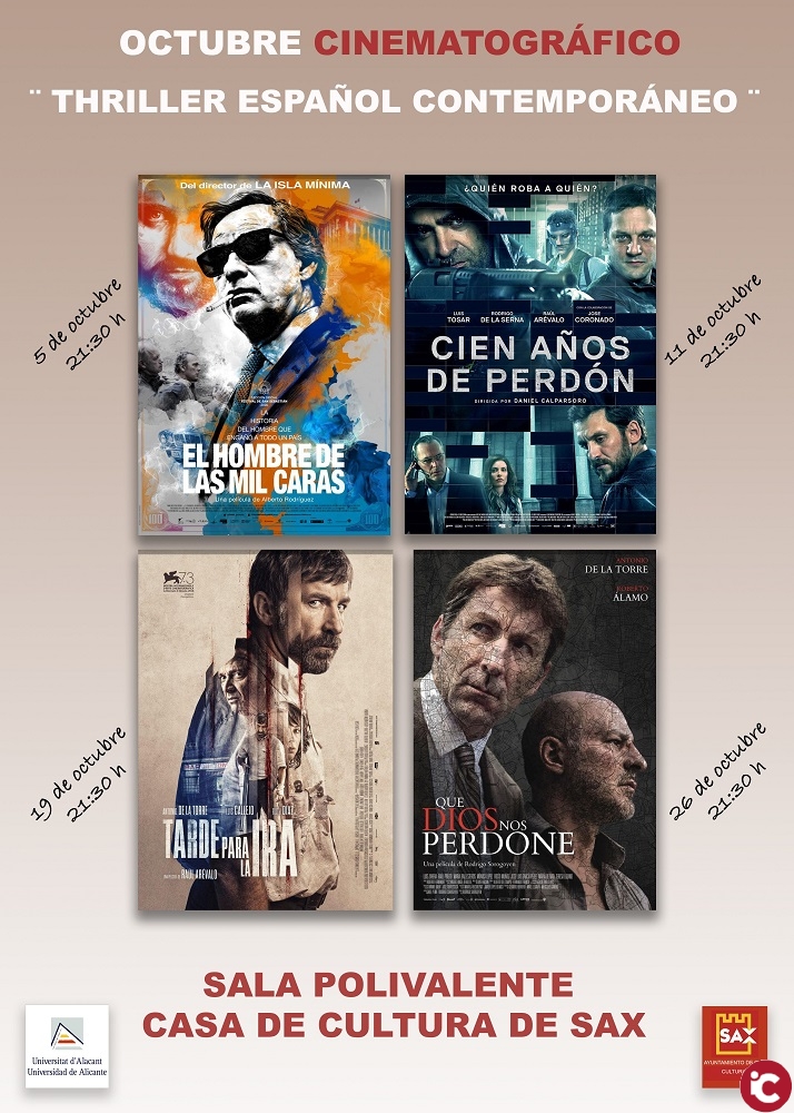 El Aula Universitaria de la UA en Sax acoge a partir de mañana viernes 5 de octubre un ciclo de cine dedicado al Thriller Español Contemporáneo. El ciclo está integrado por cuatro sesiones para analizar el auge de este género cinematográfico en el cine español, con cuatro proyecciones: El hombre de las mil caras (5 de octubre); Cien años de perdón (11 de octubre); Tarde para la ira (19 de octubre); y Que Dios nos perdone (26 de octubre)
