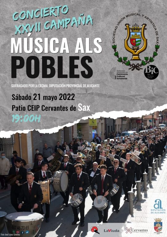La Unión Musical y Artística de Sax ofrecerá un nuevo concierto el próximo sábado 21 de mayo. El evento tendrá lugar en el patio del CEIP Cervantes de Sax a las 19:00 horas y estará enmarcado dentro de la XXVII Campaña Música Als Pobles.