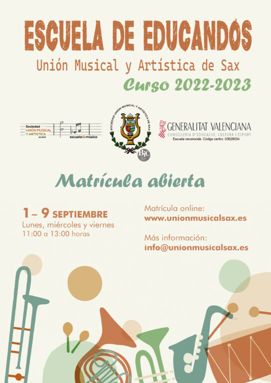 EL Gabinete de Comunicación de la Unión Musical y Artística de Sax, informa que la Escuela de Educandos de la Sociedad Unión Musical y Artística de Sax abre un segundo plazo de matrícula para nuevo alumnado para el próximo curso 2022-2023. Dicho plazo comprende desde 1 de septiembre hasta el 9 de septiembre, ya que el día 12 comienzan las clases.