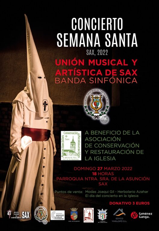 La Unión Musical y Artística de Sax ofrecerá el próximo domingo 27 de marzo su tradicional Concierto de Semana Santa. La séptima edición del evento musical tendrá lugar a las 18:00 horas en la Parroquia Nuestra Señora de la Asunción de Sax.