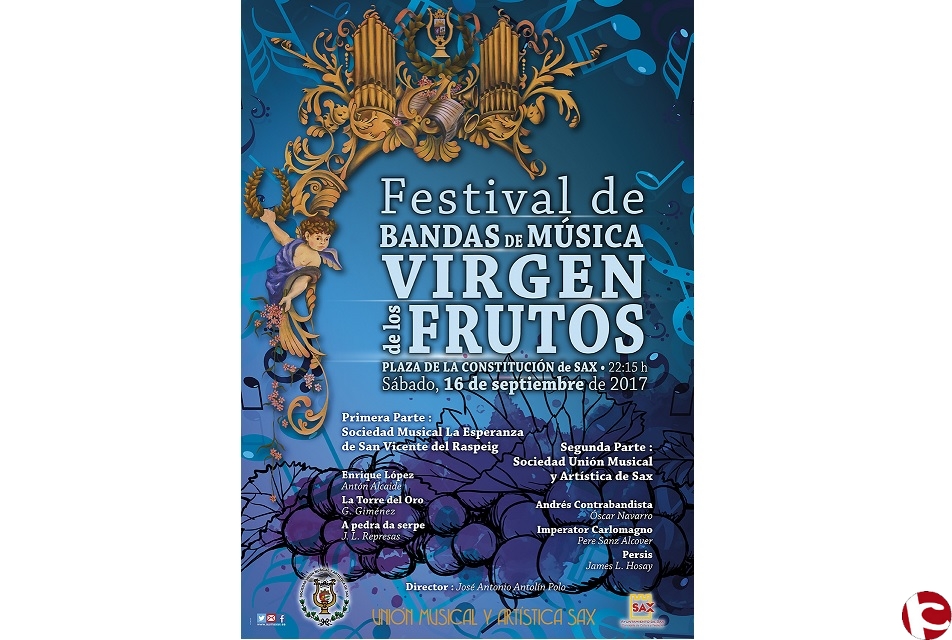 La Plaza de la Constitución de Sax acogerá este sábado, 16 de septiembre, a partir de las 22.15 h., el tradicional Festival de Bandas de Música «Virgen de los Frutos», en el que participará la Sociedad Unión Musical y Artística de Sax y la Sociedad Musical «La Esperanza» de San Vicente del Raspeig.