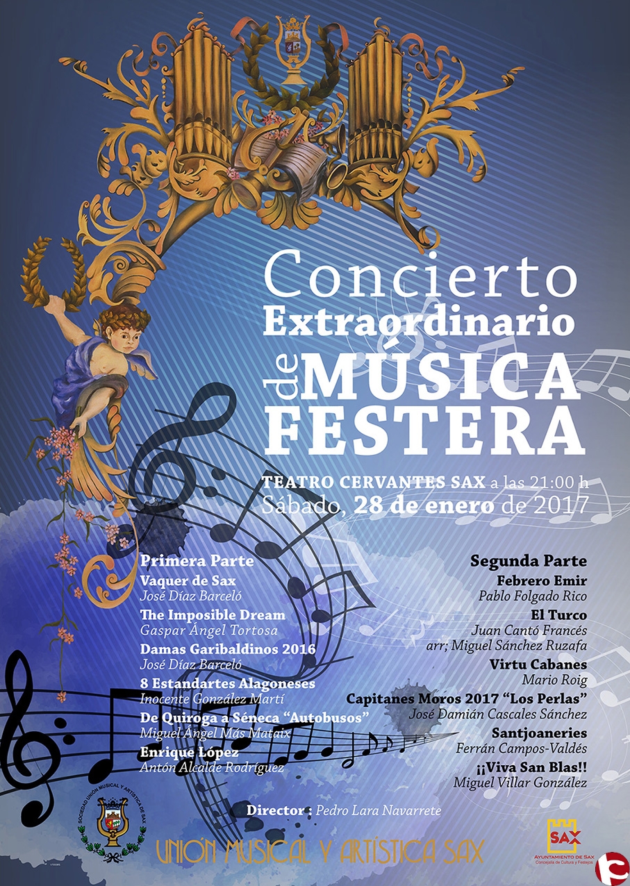 Se acercan los días grandes para Sax con sus fiestas de Moros y Cristianos en honor a San Blas. Por esta razón, la Sociedad Unión Musical y Artística de Sax ofrecerá, como es tradición, su concierto de Música Festera el próximo sábado 28 de enero a las 21 h. en el Teatro Cervantes de Sax.