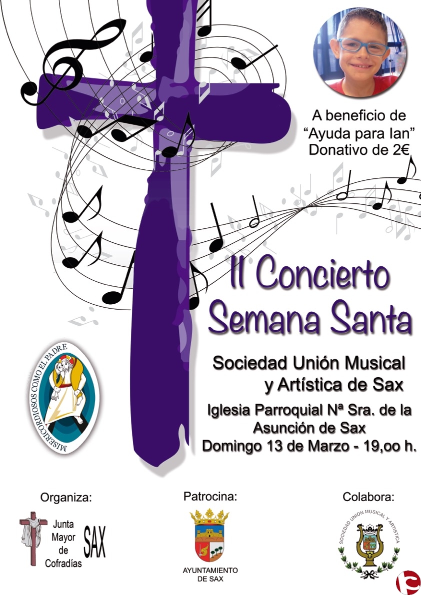 La Sociedad Unión Musical y Artística de Sax colaborará este domingo con la familia de Ian, el niño sajeño que necesita un costoso tratamiento médico especial para seguir adelante y que, además, es nieto de uno de nuestros componentes. Por esta razón, el II concierto de Semana Santa, que organiza la Junta Mayor de Cofradías de Sax y que patrocina el Ayuntamiento de Sax, será a beneficio de esta causa, y los asistentes colaborarán con un donativo de 2 euros para tener su entrada.