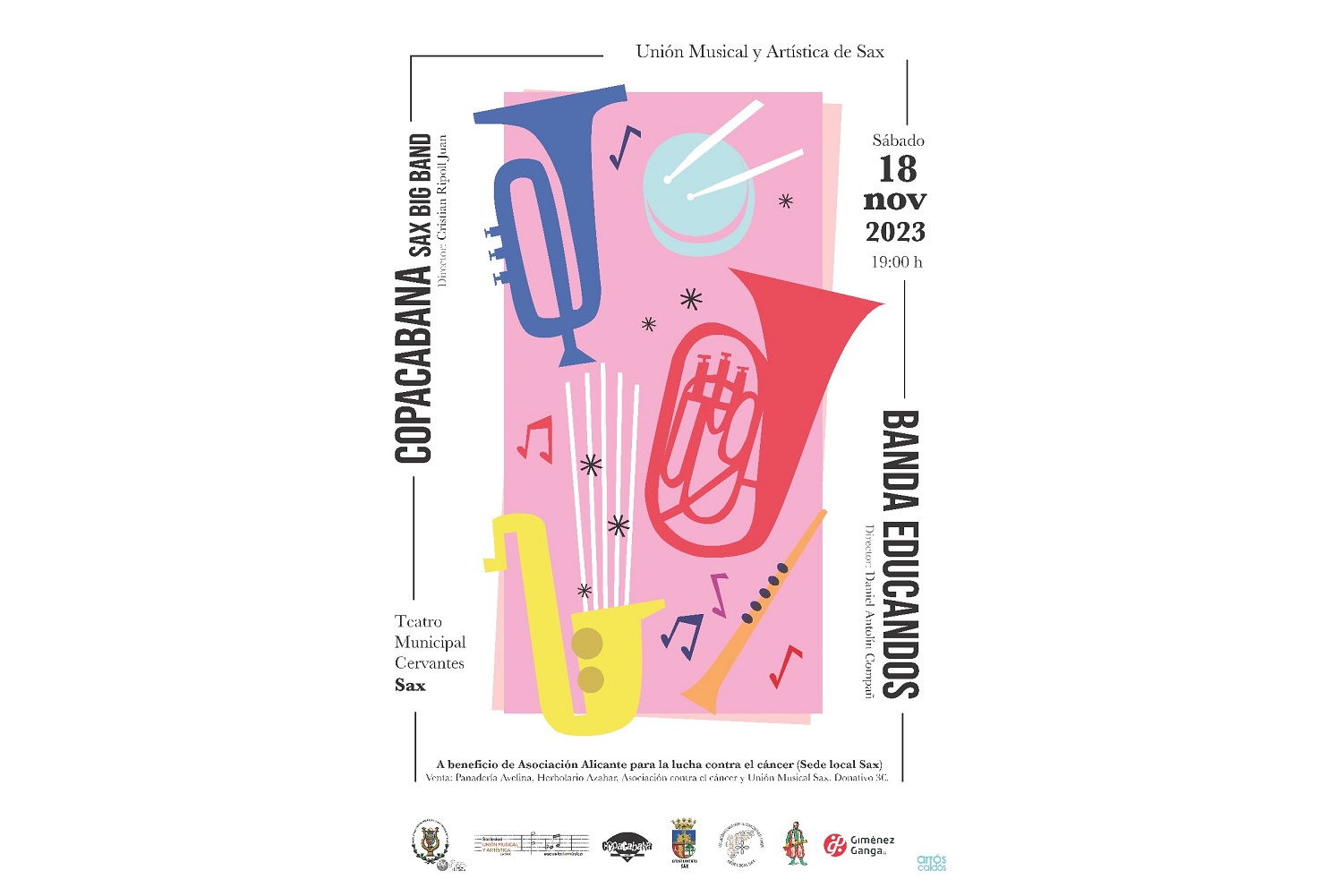 El sábado 18 de noviembre a las 19:00 horas tendrá lugar un concierto a cargo de la Copacabana Sax Big Band y la banda de educandos. Este concierto será benéfico a favor de la Asociación Alicante para la lucha contra el cáncer (sede local Sax). Las entradas, que supondrán un donativo de 3€, pueden adquirirse en Panadería Avelina, Herbolario Azahar, Asociación contra el cáncer y Unión Musical Sax.