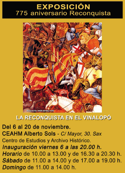 Un trabajo de un año va a ver la luz el próximo viernes día 6 a las 20:00 horas en el Centro de Estudios y Archivo Histórico Municipal de Sax. La exposición referente a la Conquista Cristiana da un salto cualitativo en las exposiciones que hemos visto en Sax, incorporando unas grandes piezas procedentes de Sax, Salinas, Villena, Campo de Mirra o Alcañiz. Todo ello complementado con unos elementos museográficos de apoyo que harán que el visitante pueda interactuar con las piezas y los personajes que se encuentran representados en la exposición.