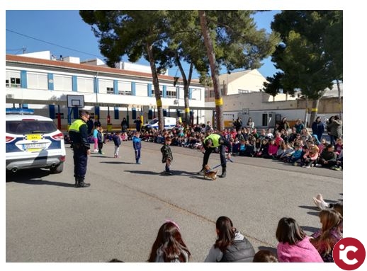 El pasado jueves los alumnos del CEIP Cervantes pudieron disfrutar de la exhibición de los perros policía, denominados K9, fruto de la colaboración entre las policías locales de Elda y Sax. Ya que el municipio de Sax no cuenta con unidad canina, pero la estrecha relación entre ambos cuerpos permite el empleo de esta unidad existente en Elda.