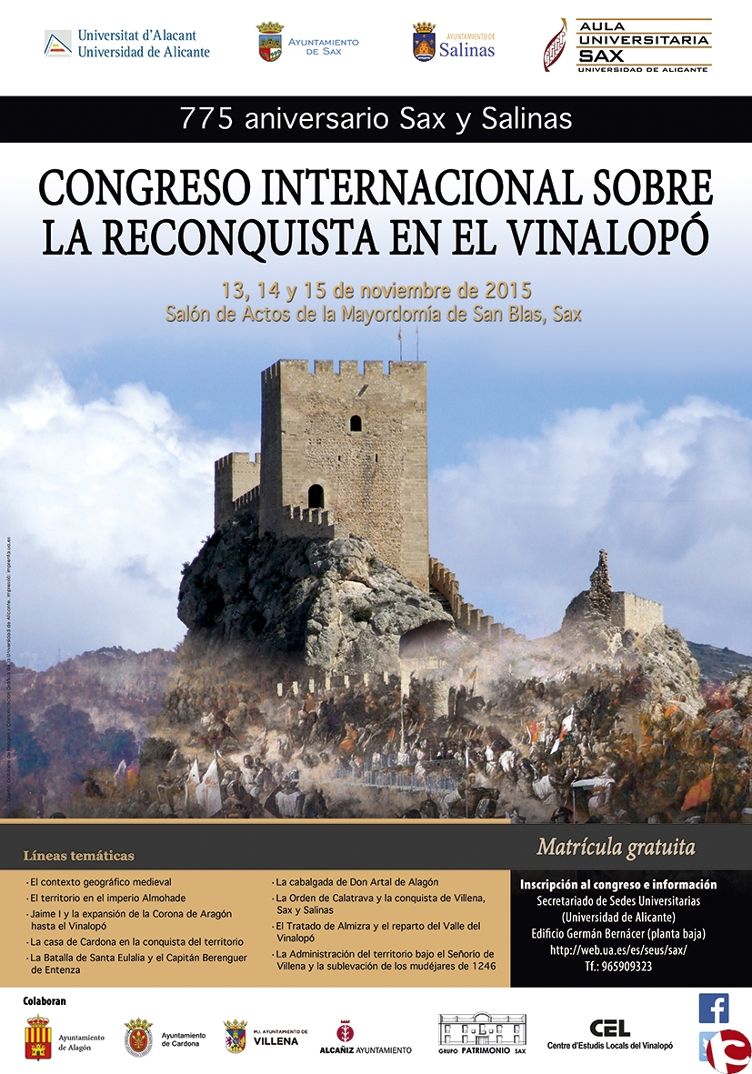 Se cumple este año el 775 aniversario de la conquista cristiana de las tierras del Alto y Medio Vinalopó, y los ayuntamientos de Sax y Salinas colaboran con la Universidad de Alicante, a través de su Aula de Extensión Universitaria radicada en Sax, para celebrar un Congreso Internacional sobre esa cricunstancia histórica, en colaboración con otros ayuntamientos e instituciones como el M.I. Ayuntamiento de Villena.