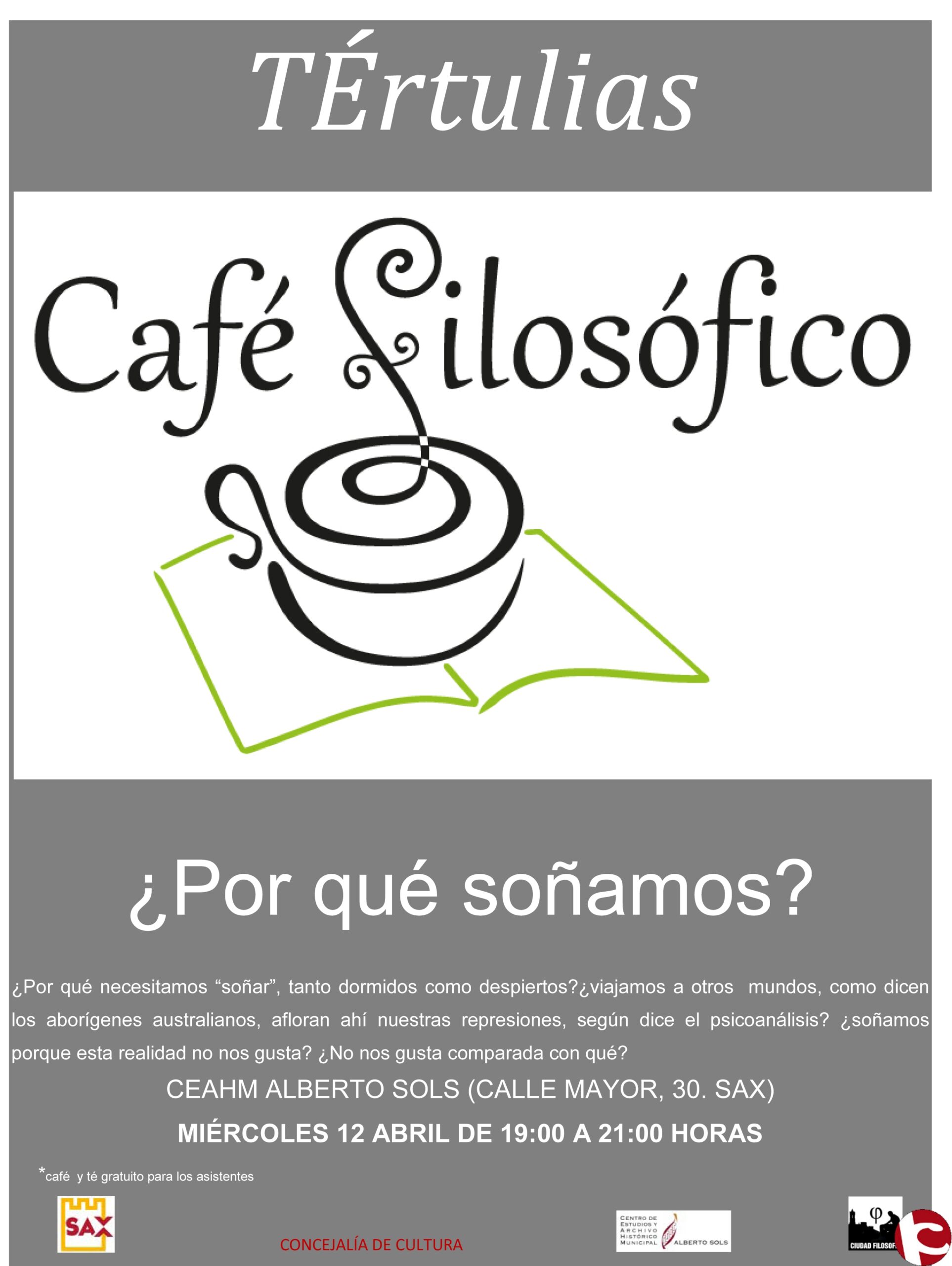 El próximo miércoles 12 de abril de 19:00 a 21:00 horas, tendrá lugar una nueva tertulia filosófica en el CEAHM Alberto Sols (C/Mayor, 30). Sax.