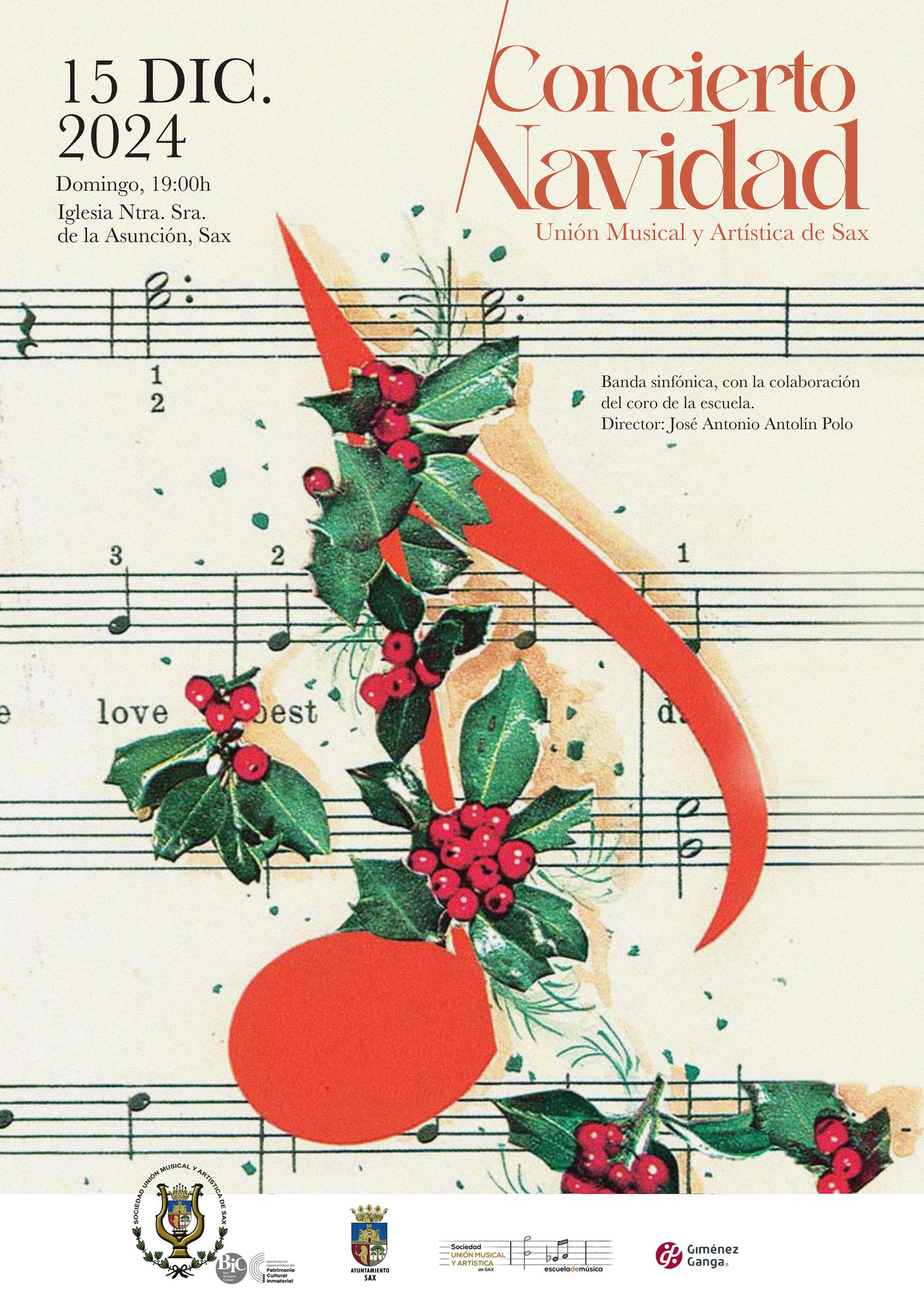 Bajo la batuta de su director, José Antonio Antolín Polo, los músicos de la agrupación sajeña interpretarán las siguientes conocidas obras: «Shalom!», «Adagio de Albinoni», «En un mercadao persa», «La lista de Schindler», «Merry Christmas Everyone», «White Christmas», «Noche de paz», «Lluna Mediterranea», «Llega la Navidad», «Feliz Navidad» y «Marcha Radetzky».