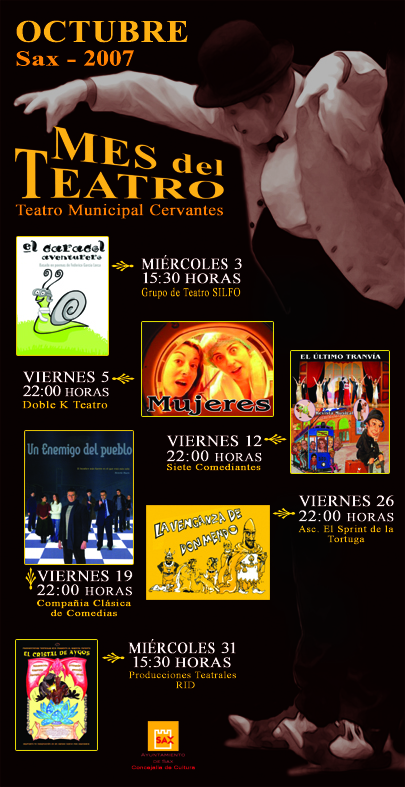 Desde hace ya varios años en Sax OCTUBRE ES EL MES DEL TEATRO, constituyendo así una apuesta fuerte desde la Concejalía de Cultura por este gran género, que sigue reinventándose año tras año, y que sigue atrayendo a un público ansioso por ver un espectáculo en directo. Gracias a esta apuesta, los amantes del teatro, tanto niños como adultos, pueden disfrutar, semanalmente, de diferentes obras teatrales.