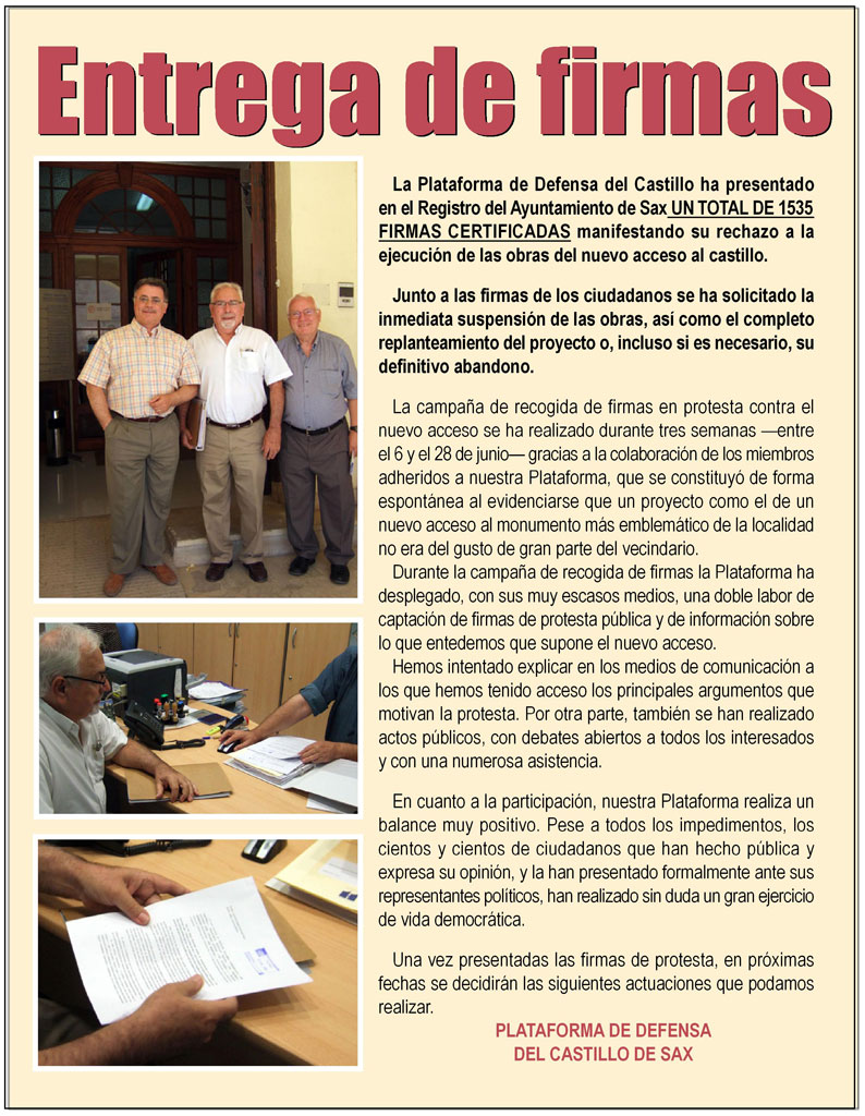 La campaña de recogida de firmas en protesta contra el nuevo acceso se ha realizado durante tres semanas entre el 6 y el 28 de junio gracias a la colaboración de los 57 miembros adheridos a nuestra Plataforma, que se constituyó de forma espontánea al evidenciarse que un proyecto como el de un nuevo acceso al monumento más emblemático de la localidad no era del gusto de gran parte del vecindario. Todas las actuaciones de han realizado con la finalidad única y exclusiva de manifestar la protesta pública e intentar la paralización las obras de un proyecto que rechazamos.