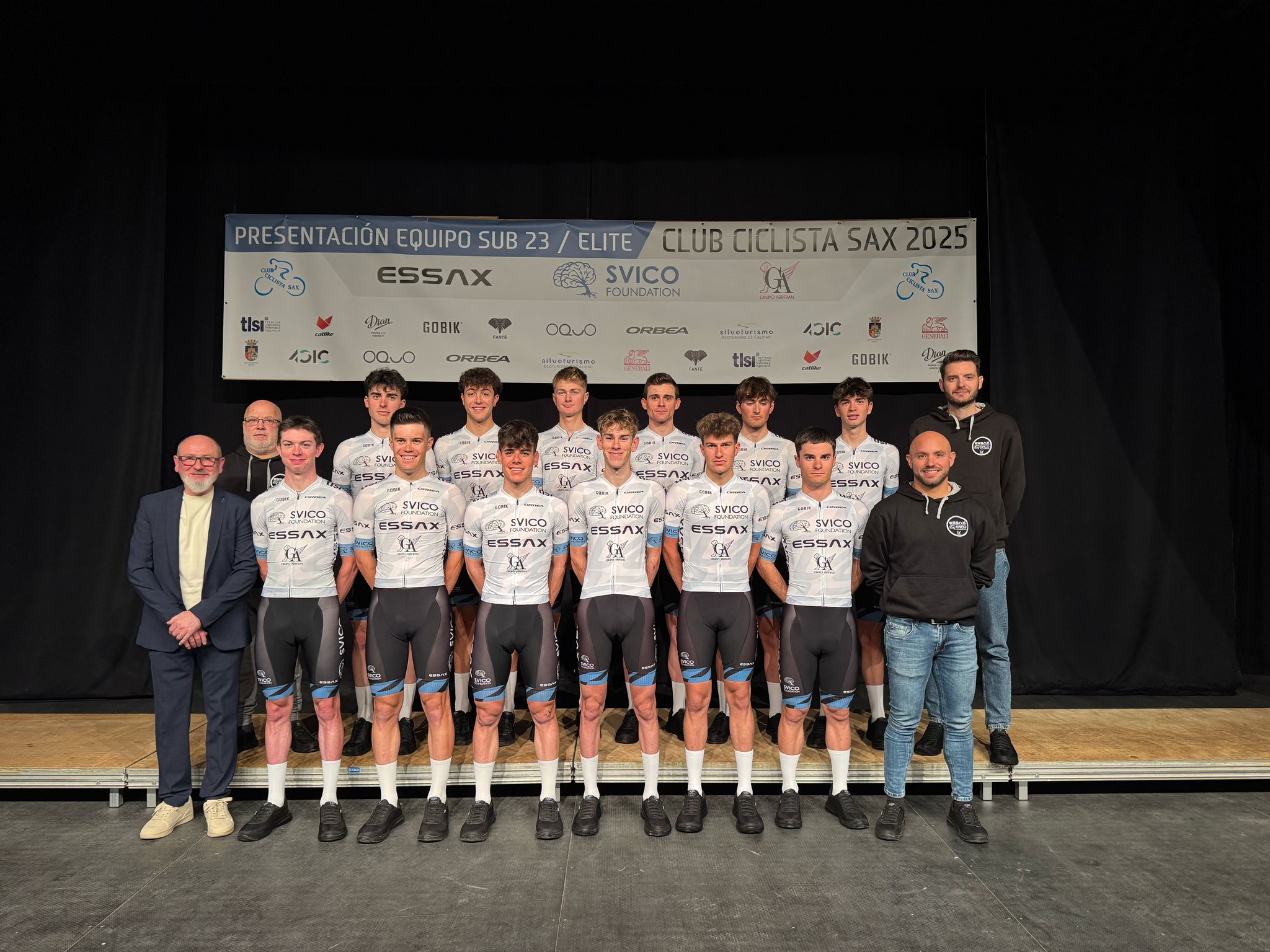 El equipo Essax-SVICO Foundation-Grupo Arrfran celebró el pasado domingo 2 de marzo su presentación oficial en el Teatro Cervantes de Sax. El evento reunió a patrocinadores, autoridades, ciclistas, cuerpo técnico y simpatizantes del conjunto, consolidando su apuesta por la temporada actual.