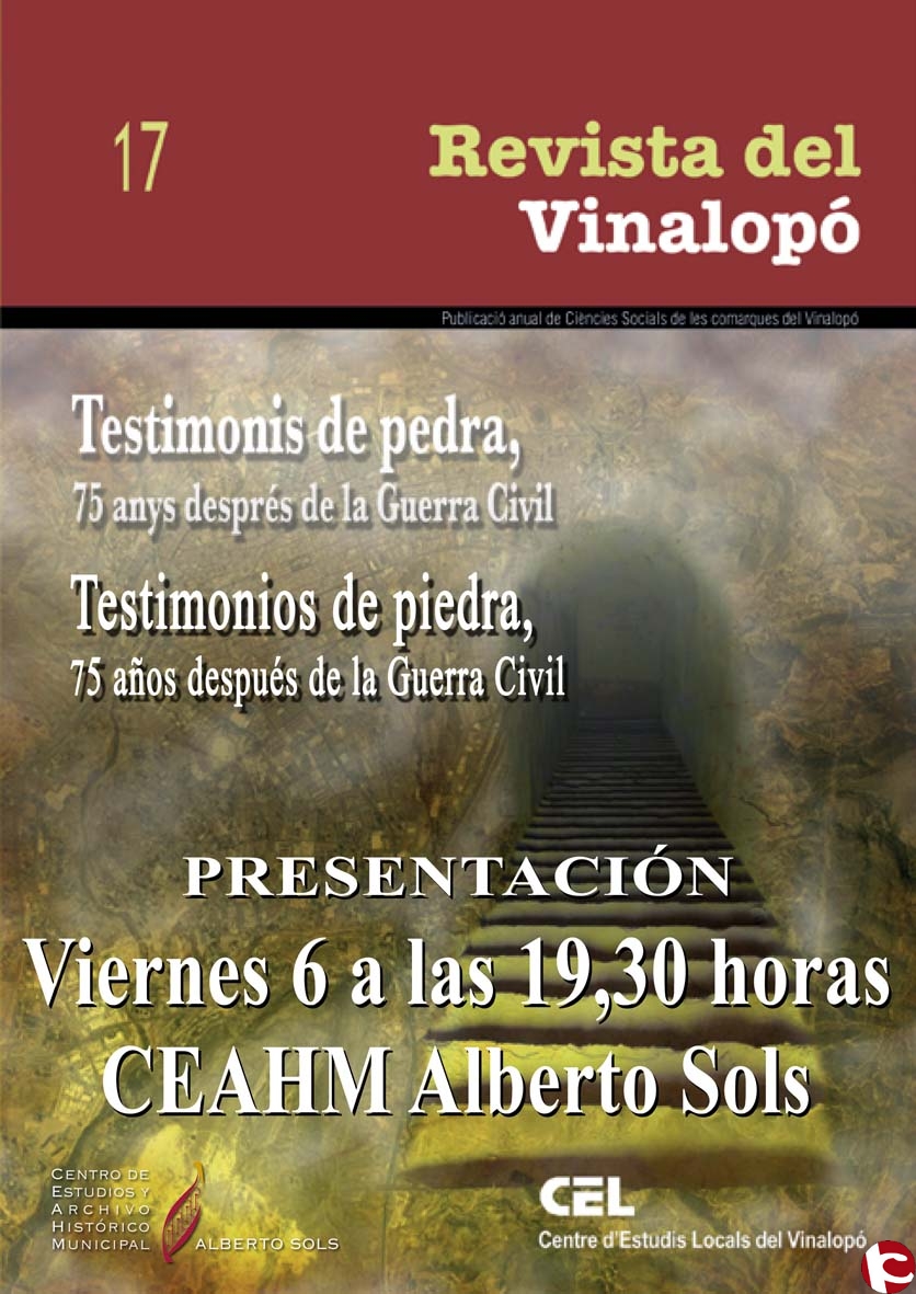 La asociación cultural Centro de Estudios Locales del Vinalopó (CEL Vinalopó), continuando con su labor de defender el patrimonio histórico-cultural de las comarcas del Vinalopó y divulgar el conocimiento del mismo, presenta hoy viernes, 6 de marzo, su última publicación de la Revista del Vinalopó 17, “Testimonios de Piedra”. El acto tendrá lugar a las 19,30 horas en el Centro de Estudios y Archivo Histórico Municipal de Sax “Alberto Sols” de Sax, el cual estará a cargo del joven y prometedor historiador sajeño D. Alberto Ochoa García.