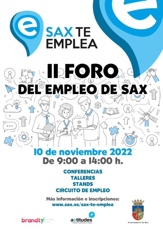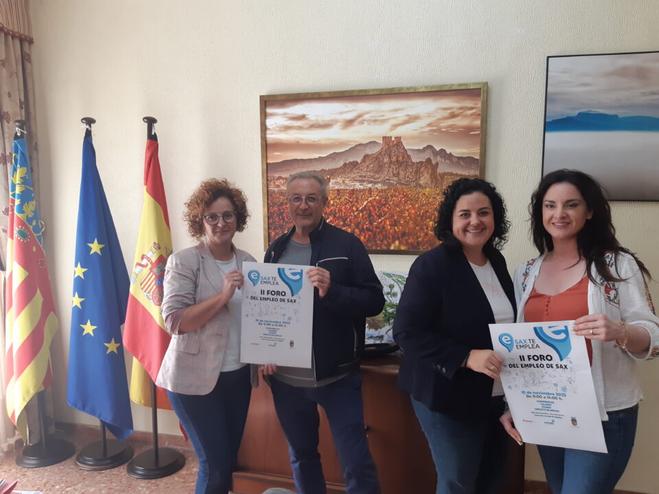 La segunda edición del Foro de Empleo: Sax te Emplea se celebrará el próximo 10 de noviembre con un formato muy similar al del año pasado y que resultó todo un éxito. “Buscamos ofrecer una serie de formación muy práctica, charlas motivacionales y un espacio donde se pueda conectar a las empresas con los demandantes de empleo, también con las opciones para mejorar su cualificación a través de los institutos de Formación profesional y con el propio Labora, ya que esta cuestión es una de nuestras prioridades”, ha indicado la alcaldesa de Sax, Laura Estevan.