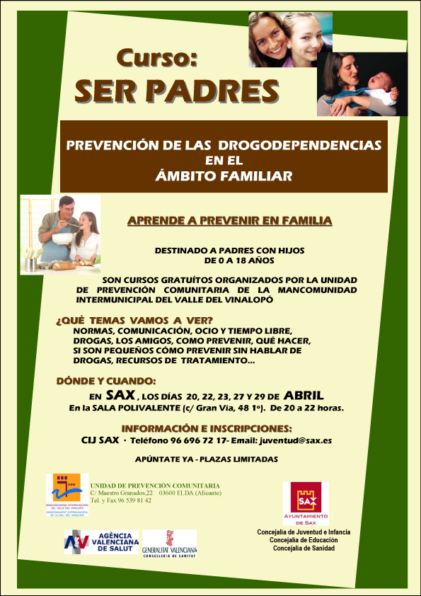 Destinado a padres con hijos de entre 0 y 18 años, el curso Ser padres. Prevención de las drogodependencias en el ámbito familiar llega a Sax con el objetivo de resolver dudas y tratar los aspectos relacionados con la educación general de los hijos, como son la comunicación que hay que establecer con ellos desde temprana edad, los comportamientos que hay que intentar inculcarles y los métodos de prevención, para que el día de mañana digan NO a las drogas. El curso, organizado por la Unidad de Prevención Comunitaria de la Mancomunidad Intermunicipal del Valle del Vinalopó, en colaboración con las Concejalías de Juventud e Infancia, Educación y Sanidad del Ayuntamiento de Sax, se celebrará en abril, los días 20, 22, 23, 27 y 29, de 20.00 a 22.00 horas, en la Sala Polivalente (junto a Biblioteca). Para más información e inscripciones, ponerse en contacto con el CIJ: 96.696.72.17 o juventud@sax.es. Plazas limitadas.