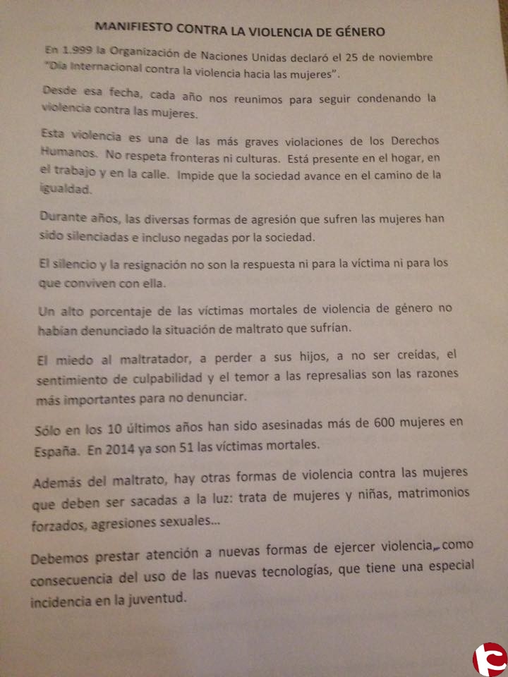 Al acto han asistido distintos Concejales, aunque hubo varios ausentes. Pedro Nieto, abría el acto, y seguidamente Cristina Aurre hacía lectura del manifiesto, y en la que se condenaba la violencia contra las mujeres, haciendo hincapié en que es una de las más graves violaciones de los Derechos Humanos, ya que no respeta fronteras ni culturas.