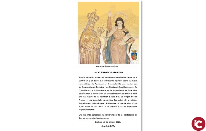 Ante la situación actual que estamos atravesando a causa de la COVID-19 y en base a la normativa vigente sobre la nueva normalidad, este Ayuntamiento ha mantenido una reunion con las Concejalias de Festejos y de Fiestas de San Blas, con el Sr. Cura-Párroco y el Presidente de la Mayordomia de San Blas, para valorar la celebración de las festividades en honor a Ntra, Sra. La Virgen de la Asunción y Ntra Sra. La Virgen de los Frutos, y han acordado suspender los actos de la citadas Festividades, celebrándose únicamente la Santa Misa a las 11:00 horas de los días 15 de agosto y 13 de septiembre respectivamente.