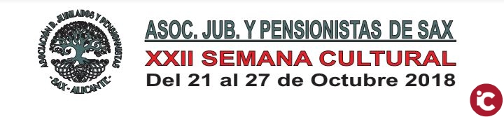 19:00 Apertura de la Semana Cultural y Homenaje a dos de nuestros socios Mayores, en el Teatro Municipal Cervantes de Sax en presencia de nuestras Autoridades locales y Junta Directiva de esta Asociación y público en general.