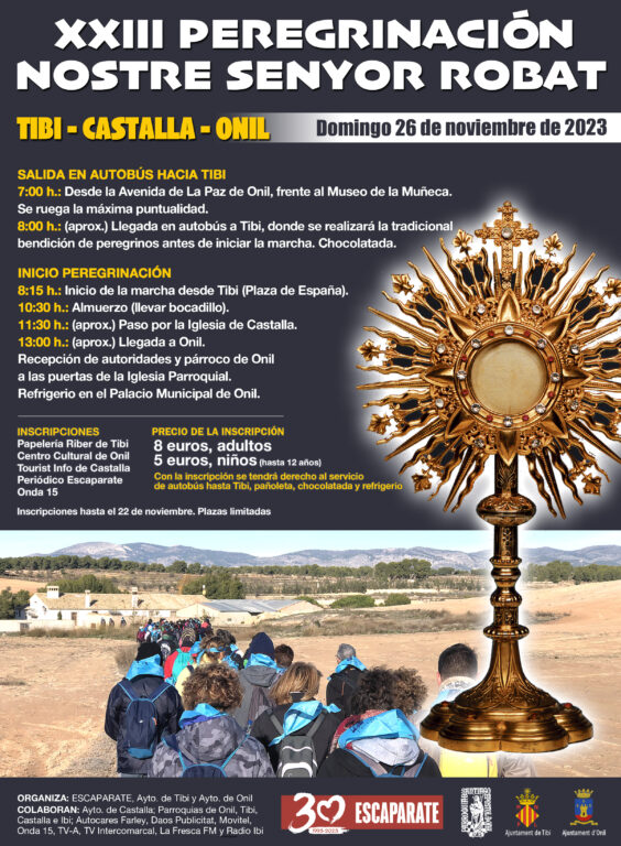 XVIII Peregrinació de Nostre Senyor Robat entre Tibi i Onil. Està organitzada pel periòdic Escaparate, la Parròquia i l´Ajuntament d´Onil. Aquest acte rememora la peregrinació entre Tibi i Onil que va tenir lloc en 1824, després que una veïna de Tibi trobara en el paratge de la Pedrera un viril d’or amb la sagrada forma consagrada en el seu interior, que havia sigut robada a Onil per part d’un antic escolà.