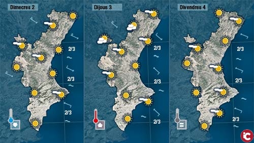 Al pas que anem tancarem la setmana sense poder parlar de canvis, sense lesperança de tindre pluja, perquè dimecres el dia serà més fresc en girar el vent a mestral, però dijous quedarà quasi encalmat bufant de nou dorigen marítim a partir de divendres per donar pas a un cap de setmana que de no canviar les coses vindrà marcat de nou pel sol i la calor.