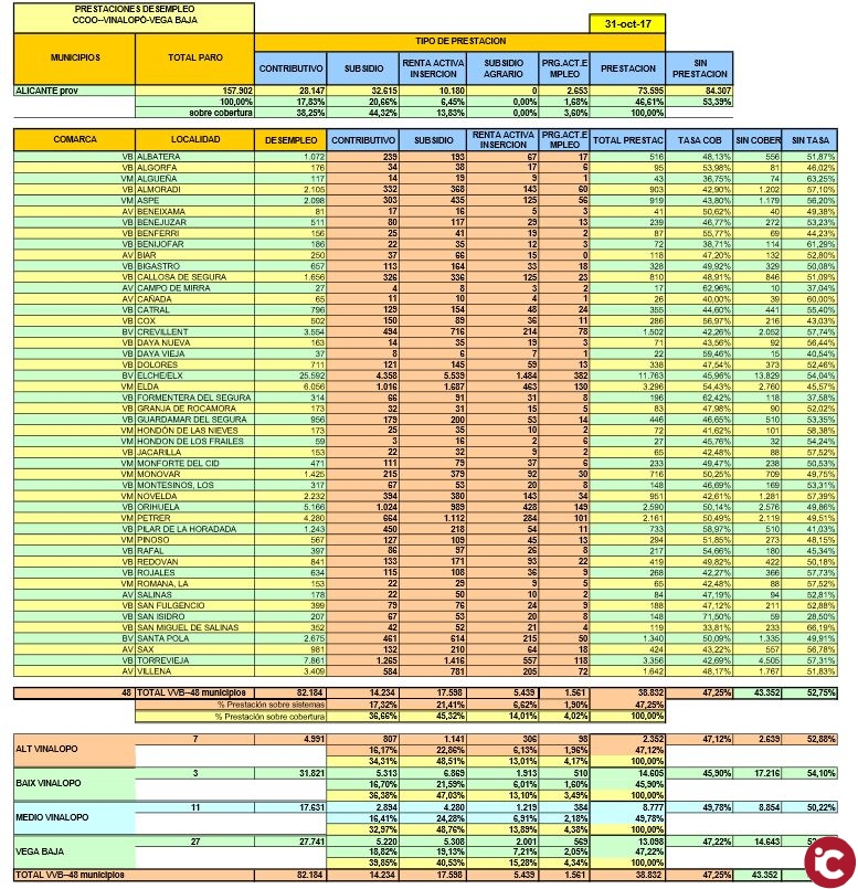Tras analizar los datos de los Servicios Públicos de Empleo sobre las prestaciones en el mes de Octubre, la cobertura de las personas en paro es del 47.25% en el ámbito de Vinalopó-Vega Baja (38.832 personas).