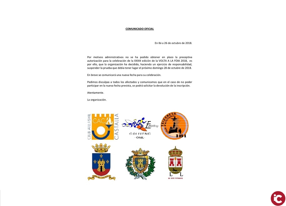 Por motivos administrativos no se ha podido obtener en plazo la preceptiva autorización para la celebración de la XXXIII edición de la VOLTA A LA FOIA 2018, es por ello, que la organización ha decidido, haciendo un ejercicio de responsabilidad, suspender la prueba que debía tener lugar el próximo domingo 28 de octubre de 2018.