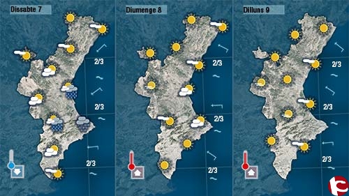 Per davant tenim un cap de setmana on loratge començarà variable, més fresc i amb més núvols que fins i tot podran deixar algun ruixat en punts de la costa central i del sud de València dissabte, però acabarà amb sol i temperaatures més altes,sobretot dilluns.