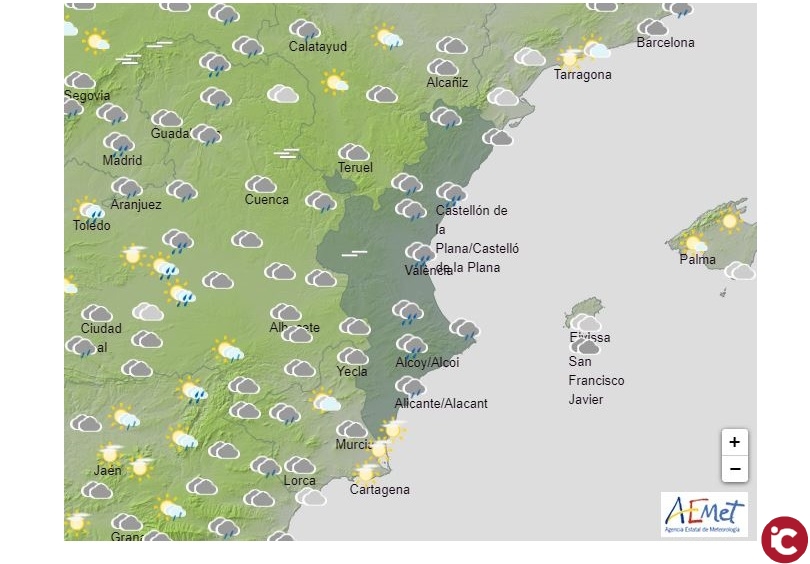Cielo nuboso o cubierto con precipitaciones que se extenderán de sur a norte por la mañana, ocasionalmente acompañadas de tormenta, y sin descartar que sean localmente fuertes.