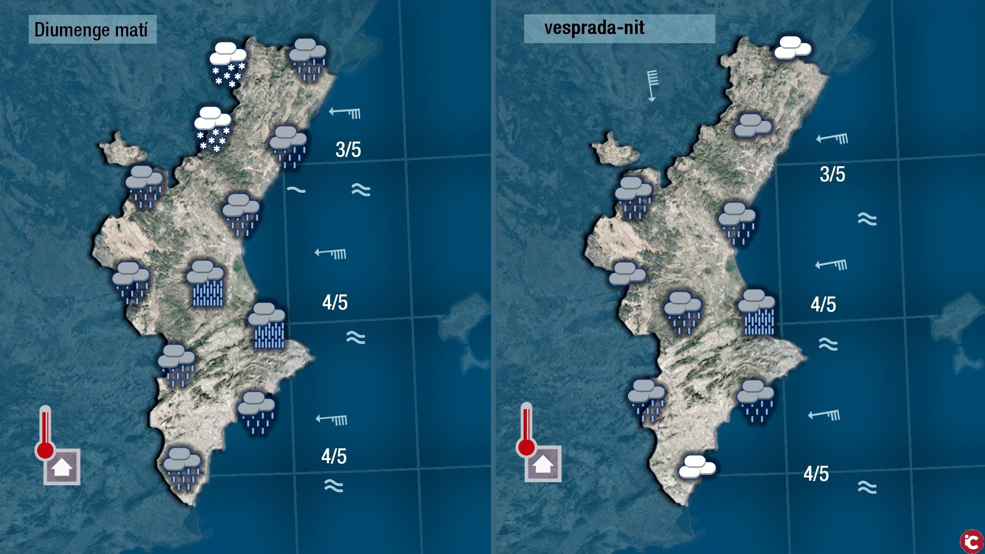 Estem a l’espera de la pluja: els mapes continuen donant pluges esta nit a la mitad sud de la Comunitat, i per a demà també donen pluges a Castelló. Sembla que no seran tan intenses com les que s’esperen al sud, però seran benvingudes. Pense que la cota de neu quedarà alta, per damunt dels 1.400 metres