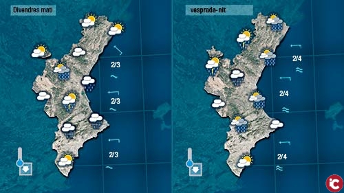 Demà divendres també esperem un oratge molt variable i insegur. No plourà ni molt ni per tot arreu però podrà ploure ala major part de la Comunitat abans que acabe el dia.