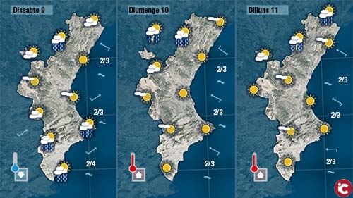 Demà divendres també farà sol i un poc més de calor. De tota manera a poqueta nit augmentarà la nuvolositat per linterior anunciant larribada dun front de matinada. No obstant, sembla que no serà massa actiu i només cal esperar ruixats dèbils per linterior i al nord.