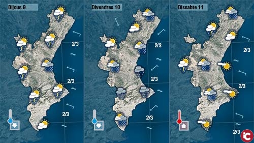 Divendres els núvols ens acompanyaran des de primera hora del dia. Serà un dia gris i tot apunta que també podrà ser plujós. El vent bufarà de gregal deixant la mar més alterada i les temperatures prou més baixes.