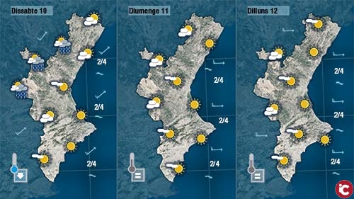 Dissabte els núvols seran mé abundants, especialment des de migdia, la qual cosa deixarà més baixes les temperatures. A partir de migdia o primera hora de la vesprada cal esperar pluges dèbils a la mitad nord de la Comunitat. Diumenge i dilluns, una volta passat en front, recuperarem el sol i el ponent es deixarà sentir de nou per tot arreu.