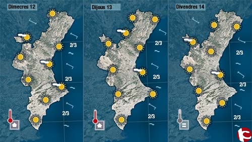 Pot ser esta vesprada tinguem un poc de moviment a les muntanyes del nord, on de forma local podria quallar alguna tronada, però el sol lluirà a la major part de la Comunitat i les temperatures pujaran un parell de graus.