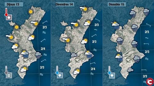 Dijous i divendres la nuvolositat quedarà concentrada al sud on podria ploure en punts de La Marina, La Safor, La Vall dAlbaida, LAlcoià o el Comtat. Al centre i al nord en fer més sol pujaran les temperatures. Entre divendres i dissabte notarem com baixen de nou les temperatures. Caldrà fonfirmar-ho però dissabte sembla que de nou torna la possibilitat de pluja.