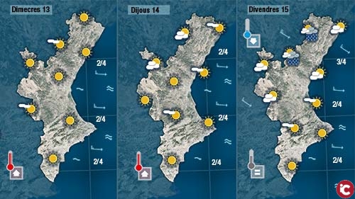 Dimecres, dijous i divendres tindrem al sol com a principal protagoniste de loratge. En bufar de ponent deixarà les temperatures més altes fins que divendres torne a bufar el mestral i porte un nou descens de les temperatures.