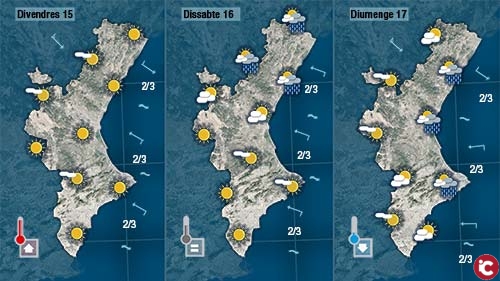 Demà dijous el mestral encara es deixarà sentir amb força al nord fins entrada la vesprada . Al centre i al sud encara que el vent dominant siga el xaloc (sud-est) també pujaran les temperatures diürnes.